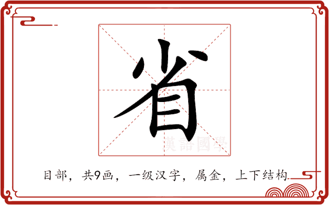 〔省〕字造字法是会意兼形声。从“目”,从“屮”(甲骨文或从“木”),象眼睛观察草木,“屮”声化为“生”,“生”滞古未加中横,隶书底横变撇,“丷”变“八”,遂变为“少”形。( xǐng )。本义是察看。