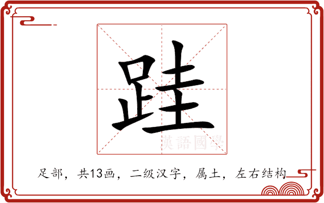 跬,通用规范汉字,二级汉字,序号5452,读音是(kuǐ),足部,共13画,形声字,左右结构,五行属土。