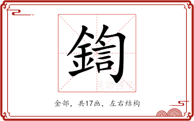 鍧,位于中日韩统一表意文字 (基本汉字),Unihan编码U+9367,读音是(hōng),金部,共17画,左右结构。