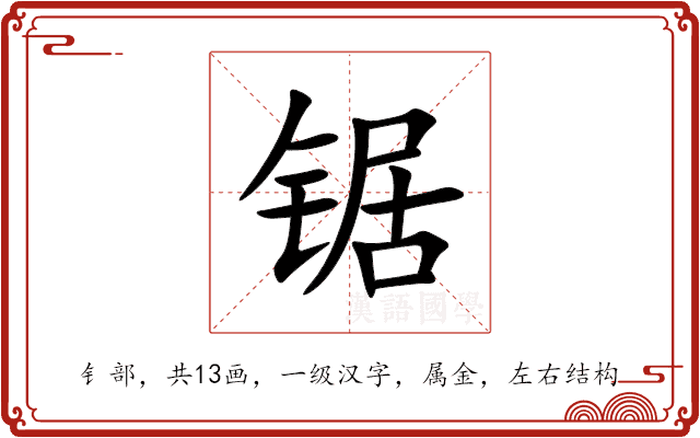〔锯〕字拼音是(jù),部首是钅部,总笔画是13画