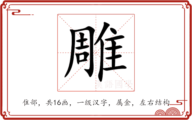〔雕〕字造字法是形声。从隹( zhuī ),周声。从“隹”,表示与鸟类有关。本义是大型猛禽。日间活动的大猛禽(鹰科。