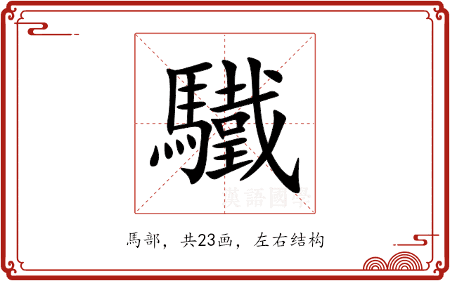 驖,位于中日韩统一表意文字 (基本汉字),Unihan编码U+9A56,读音是(tiě),馬部,共23画,左右结构。