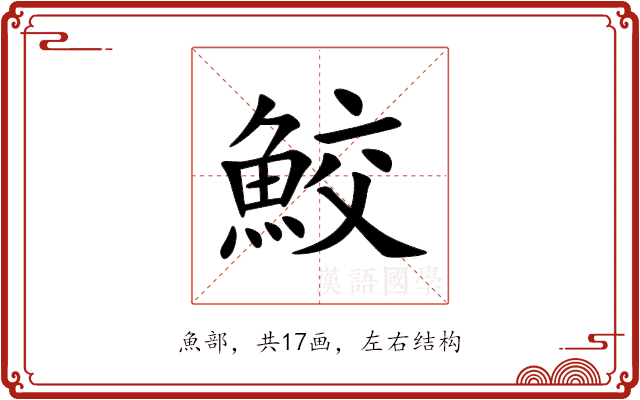 鮫,位于中日韩统一表意文字 (基本汉字),Unihan编码U+9BAB,读音是(jiāo),魚部,共17画,左右结构。