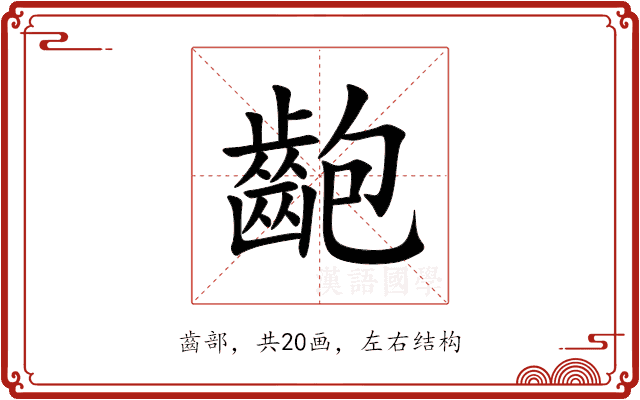 齙,位于中日韩统一表意文字 (基本汉字),Unihan编码U+9F59,读音是(bāo),齒部,共20画,左右结构。